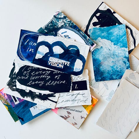 I may have mentioned I like to create an overarching theme for my work and assign a word of the year that will serve as a focal point for myself in the upcoming year. Mindset is the word for 2024, allowing myself the space and using creativity to let go and shift away from what no longer serves me. Easy, right? So, I started asking myself some questions. How can I put this into practice? What practical things can I do, and what that looks like as a daily-ish creative practice? Because spending time in a sketchbook is such a comfortable and familiar place for me and I love writing, it made perfect sense to incorporate words, phrases, and images into some of my sketchbook work. I’ve taken a deep dive and over the last several months have been doing some serious art journaling. Combining that with intention setting and making affirmation cards has proved very rewarding—another great way to keep the creative momentum going with small, accessible art projects. I am always looking for new creative outlets. I want to share what I’ve discovered and offer some classes soon speaking to this and how I have made it part of my regular creative practice. (more details below)